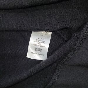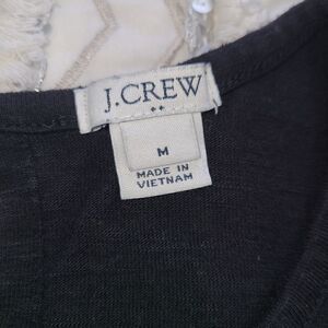 J. Crew sleeveless black blouse with a semi-sheer black trim on bottom. Small side splits for looser fit and rounded bottom hem corners. Front middle seam. Body 70% viscose, 30% polyester. Trim 100% polyester.