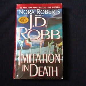Set of J.D. Robb novels with colorful spines. Includes titles like 'Imitation in Death' and 'Conspiracy in Death'. Perfect for mystery lovers.