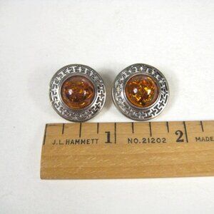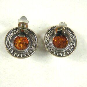 JD Signed Vintage Sterling Silver Baltic Amber Clip On Earrings Round Intricate