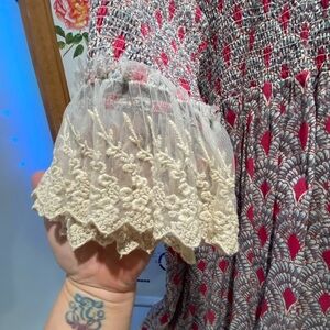 This elegant women's top features a beautiful pattern, perfect for adding a touch of style to your wardrobe. The intricate design and comfortable fit make it ideal for any occasion. Pit-to-pit 25”, length 40”.