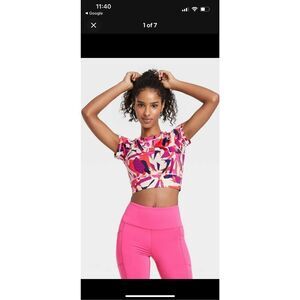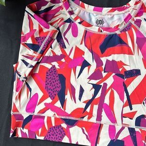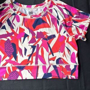 This feels so nice and is vibrant with pink, purple, and orange pattern. Short sleeve and cropish. polyester/Spandex material. This benefited Black History Month 💜🩷🧡🖤
