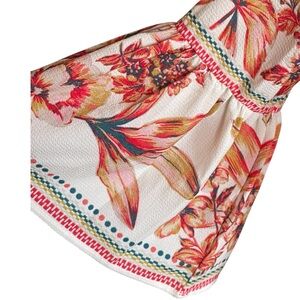 Beautiful printed pattern on this feminine off the shoulder top. Bell sleeves with tulip hem detail. Great with your favorite jeans or shorts! Made from 100% polyester. Length measures 21 inches. Pit to pit measures 18 inches. Excellent preowned condition.