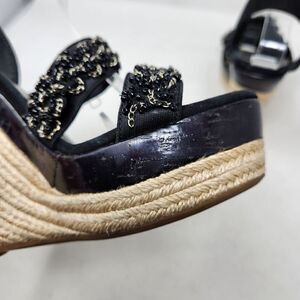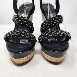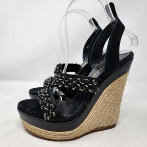 Women's size 37.5 EU tall espadrilles wedge sandals. The heels measure approximately 4.5" tall with an ankle strap. The two straps that wrap over the foot are covered in seed beads in black and gold. A few of the beads are a little loose. They can be worn as is or could be refastened. Made in Spain. Thank you so much for looking. I am always open to reasonable offers. Have a fantastic day!