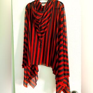 SEE THRU MESH, 3 BUTTONS IN FRONT WITH BLACK APPLIQUÉ, BLACK RED VERTICAL STRIPES