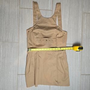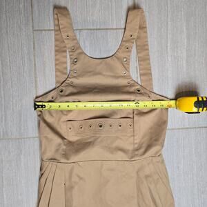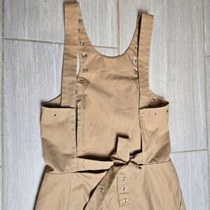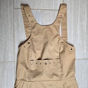 Jean Paul Gaultier vintage dress. Grommet trims all over. Sleeveless. Knee length. Front pocket. Belted. Round neckline. Adjustable straps with snap-on closure. Belted. Hidden zipper. Beige khaki color.