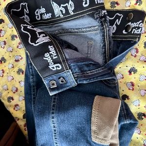 The vintage indigo stretch denim and low rise styling combine to create breeches that not only give a comfortable ride, but look amazing on the town with fashion boots or cowboy boots as well. Chamois Ultrasuede knee patches, belt loops and back pocket trim make the look. You'll wonder how you ever did without them!
