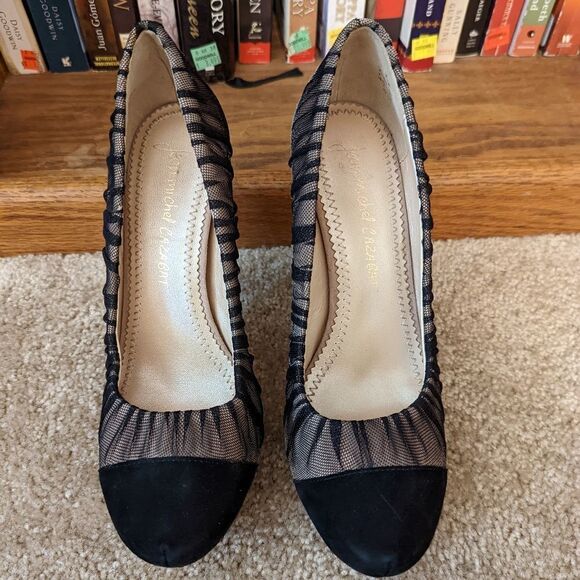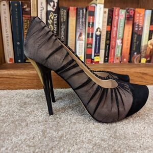 JEAN-MICHEL cazabat horn stilleto heel suede cap toe black mesh overlay sz 38.5