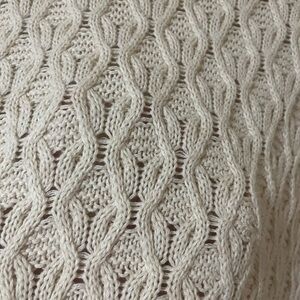 Elegant cream sweater with a cozy cowl neck. Intricate knit design. Ideal for layering.
