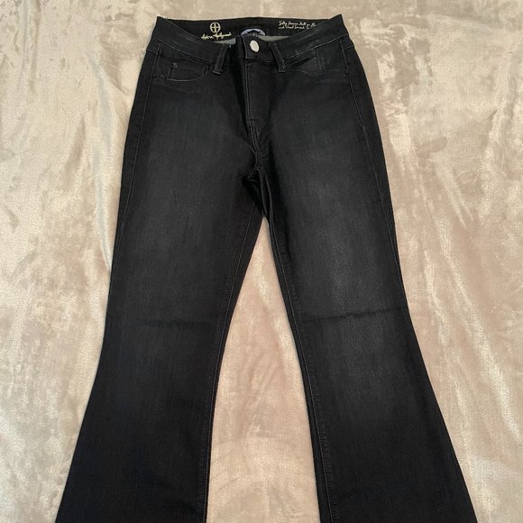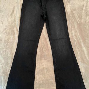Dark Wash flare jeans with high rise. Pull on with faux front zipper, back pockets. Silky Stretch material. Size 8.