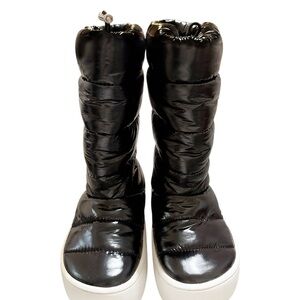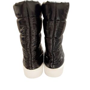 Stylish black puffer boots featuring a sleek white sole. Perfect for a chic winter look. Fits true to size, order your normal size