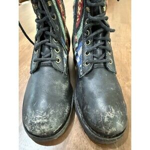 Jeffrey Campbell distressed leather combat boots with 2-way wear — lace up for a classic combat look or fold down to show the woven Southwestern/Aztec panels and studded flaps. Rugged lug soles and a soft leather upper create a bold, festival-ready streetwear style. Distressing, creasing and wear on leather and toes add authentic vintage character; soles show expected wear but function is not affected.