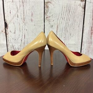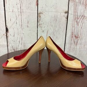 Step out in style with these elegant peep-toe heels. Featuring a chic tan exterior and a bold red interior, these shoes are perfect for many occasion. Elevate your wardrobe with this sophisticated design.