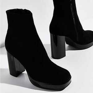 Standout in these so retro and 60s-inspired boots featured in a short, ankle height and soft suede fabrication with side zip closures, a towering block heel, and round toe.