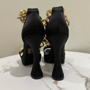 Gleaming chain links add modern glamour to a standout satin sandal set on a lofty flared heel. 4 3/4" heel; 1" platform (size