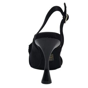 Satin pump with a plume design over the toe. The slingback style buckle strap will add comfort and security to this classic style!
