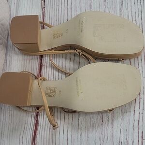 Elevate your style with Jeffrey Campbell tan sandals, featuring a chic ankle strap design and a comfortable block heel. Padded insoles for extra comfort. These versatile sandals are perfect for both casual outings and semi-formal events, offering a modern aesthetic with their clean lines and leather-like material.