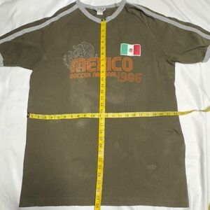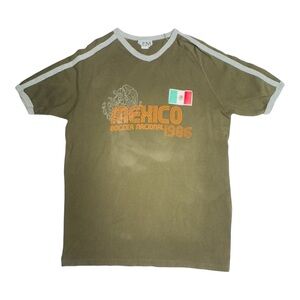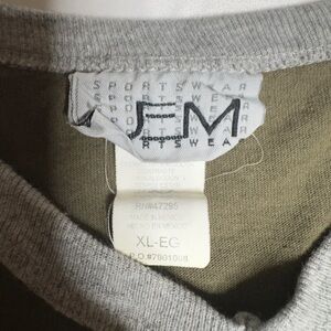 This JEM tee showcases a vibrant green color with a bold orange graphic on the chest, enhanced by a contrasting white V-neck collar and sleeve stripes. Perfect for casual outings, it offers a sporty and stylish look.