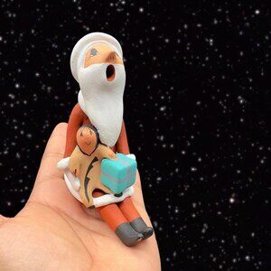 JEMEZ PUEBLO HAND MADE CLAY SANTA STORYTELLER w CHILD DIANE LUCERO Signed 5”W 4”.