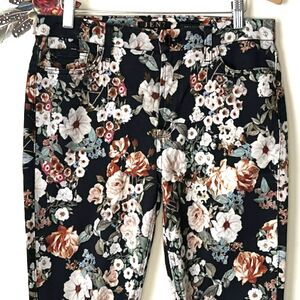Black background with vintage inspired floral print, 5 pocket styling, zipper fly, skinny leg, ankle length. Made of machine washable Cotton & 2% Spandex. In excellent condition