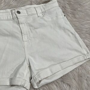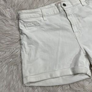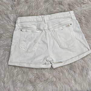 White stretch denim cuffed shorts from Jen7 by 7 For All Mankind. Faux front pockets and two back patch pockets. Zip and button front closure. White Jean shorts. Gently used condition.