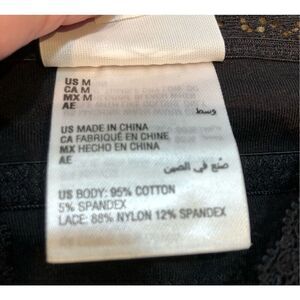 Jenni Intimates “On Repeat” Wide Lace Bralette in Deep Black, ladies size medium. This bralette has wide lace trim, moderate coverage, adjustable straps, and pullover styling (no connector or hooks in back). There is no padding, and it’s made of a cotton and spandex blend. It’s 95% cotton and 5% spandex. The lace is 88% nylon and 12% spandex. Machine washable. The circumference around the bottom band is 26” (without stretching at all). This is a cute and feminine bralette and it’s NWT!