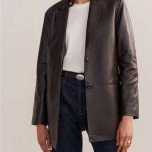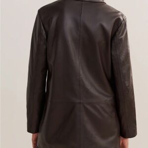 Stunning Sophisticated leather blazer by Jenni Kayne. Currently in stores and online this season for $1295. A dark chocolate brown that is versatile as it can also read to work with black. Only worn once!. Perfect for a polished look. Meet the new essential you'll add to your wardrobe today and style for years to come. With an elongated silhouette, this piece is great for layering and it's primed for all types of styling needs. Wear it as a jacket over a sweater, t-shirt, or blouse-and pair it with jeans, a skirt, or trousers through the seasons.