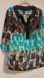 Beautiful silky teal, black, and brown tunic blouse with V Neck that’s embellished with thick and chunky black gem beads.