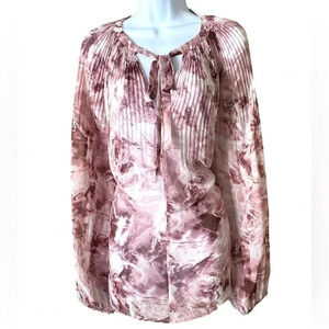 Jennifer Lopez Women's mauve and cream color Boat Neckline Chiffon Blouse. Tie bow at neck line in the front. Flowing elegant blouse. Pull over head. Long Sleeve Blouse with elastic at wrists.