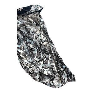 • Features: Blue, Gray, Black and White Snakeskin Print With Ruched (gathered) Sides And Gold Side Zipper!