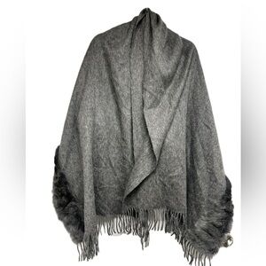 JENNIFER SUN Grey Genuine RABBIT Fur Trim CASHMERE/WOOL SHAWL CAPE WRAP SCARF