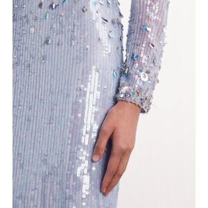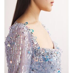 Embrace timeless elegance in this gown, a masterpiece of shimmering sophistication. The square neckline, framed by delicate embellishments, imparts a regal touch, perfectly complementing the gowns refined silhouette. Long sheer sleeves, adorned with subtle beading, exude an ethereal grace and charm. The fitted bodice flows seamlessly into a floor-length skirt, adorned with sequins and intricate beadwork that reflect light beautifully with every movement.