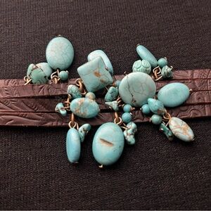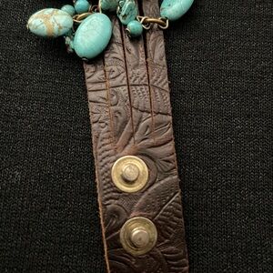 This gorgeous handmade, hand-tooled leather layered look bracelet has a total of 35 multi-sized genuine turquoise stones / charms attached. It also has a small brass signature charm on one end. Fittings are made of brass and have a little patina which adds to the allure. It has the extra benefit of 2 lengths that can be used for that proper fit. This bracelet will soon be your favorite. Perfect alone or layered with your other favorite pieces. Will be sent securely in a gift box.