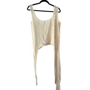 Soft and lightweight boho-style sleeveless top in a creamy off-white color. Features a scoop neckline, asymmetrical hem with long front drapes, and one side made of beautiful crochet lace for a romantic touch. Perfect layered over a bralette, cami, or flowy dress for a dreamy cottagecore or festival look.
