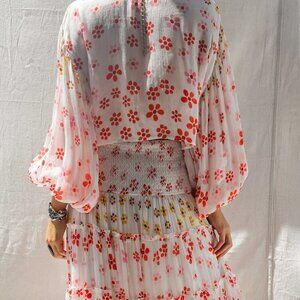 Free Love Top features a lace-up front, lace trim, and blouson sleeves. Part of our Painted Daisy Collection, this top features our hand-painted watercolor daisy print in a rainbow of blue, red, pink, green, and gold on white, semi-sheer cotton crinkle.