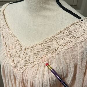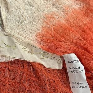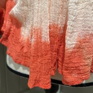 Jen’s Pirate Booty flowy, gauze-like top with v-neck embroidered lace detail. Boho, cottage core and beachy vibes. Soft, cotton knit, orange/peach ombre, lightweight fabric. Small spot as indicated, likely washable. Size small, oversized.