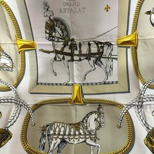 Elegant Hermès "Grand Apparat" silk scarf, designed by Jacques Eudel. This classic accessory, first issued in 1962, features an equestrian motif. Please look at pictures as part of description and ask questions.