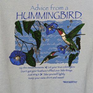• It reads on the Sweatshirt - "Advice from a Hummingbird Sip the sweet moments / Let your true colors glow / Dont get your feathers ruffled over little things / Just wing it / Take yourself lightly / Keep your visits short and sweet!