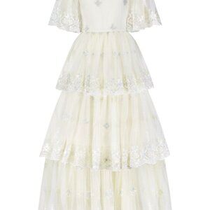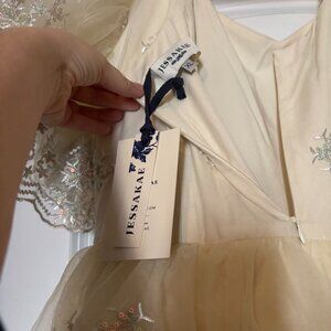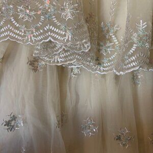 Another dress bought for a wedding and never worn (still has tags). This beautiful cupcake dress, with delicate silver sequin is a wonderful addition to any wardrobe. The dress is gown length, with flutter sleeves and a tiered skirt. Nearly a ballgown.