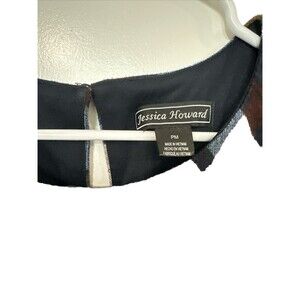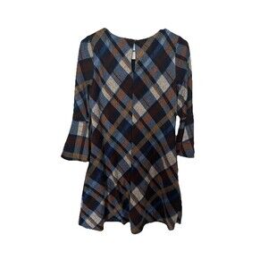 This charming Jessica Howard dress, size Petite Medium (PM), features a classic plaid pattern in shades of blue, brown, and cream. The dress has stylish bell sleeves and a comfortable, relaxed fit. It's perfect for a casual yet chic look.