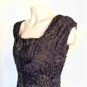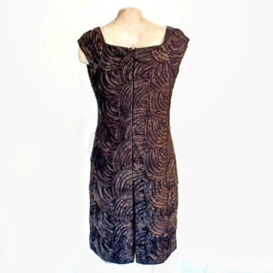 Amazing form-fitting sheath dress covered in a swirl of black and metallic gold ribbon.
