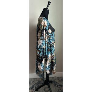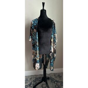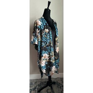 JESSICA MCCLINTOCK Blue Black Moody Floral Gold Accent Mid Line Kimono One Size