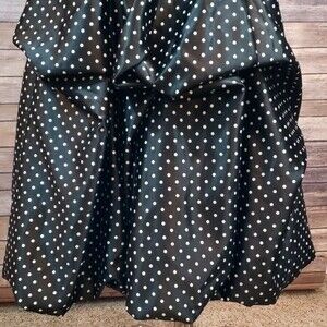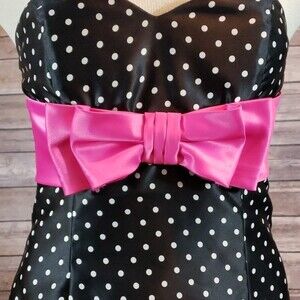 Pre-owned vintage Jessica McClintock for Gunne Sax black and white polka dot dress size 7. Please use measurements below for fit since vintage tends to run small. Strapless sweetheart neckline with hot pink bow detail below. Bubble draped skirt with tulle underneath. One of the pin tucks may have come out-please see photos.