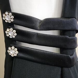 Tux-stripe detail at waist that goes around to gorgeous back detail with 3 rhinestone flower brooches on each side.