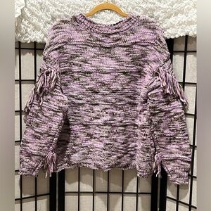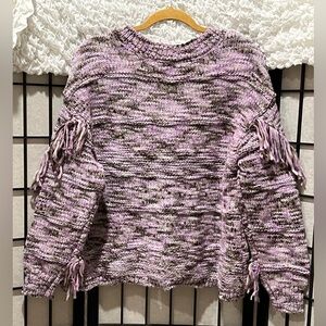 Stylish purple knit cardigan featuring fringe details and button closure. V NECK, BUTTON FRONT CLOSE, FRINGE SLEEVE TRIM, RIBBED HEM AND CUFFS, BOHEMIAN INSPIRED, RELAXED AND FREE SPIRITED, FESTIVAL CHUNKY KNIT, FOR LAYERING AND WESTERN VIBE: PRE OWNED IN EXCELLENT CONDITION: