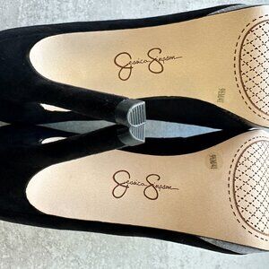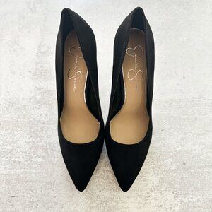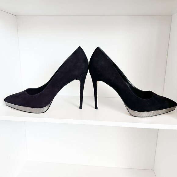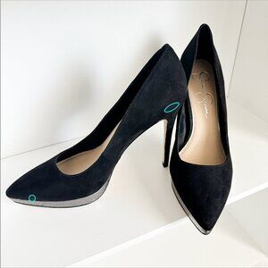 JESSICA SIMPSON Analista Platform Pump, Black Faux Suede with Silver Platform, Size 9.5 Medium