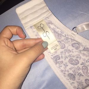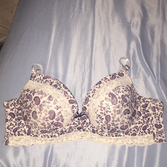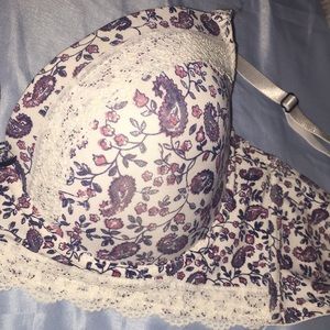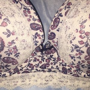 details: has lace , small black bow in middle , adjustable straps , three clasp , floral pattern