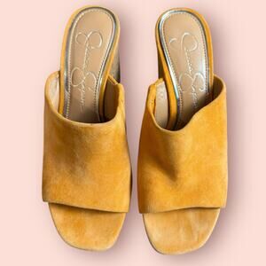JESSICA SIMPSON Cork WEDGE OPEN TOE HIGH HEELS MULES size 6w Platform Burnt Orange