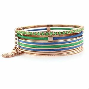 Add a splash of sparkle to any ensemble with this beautiful bracelet. Boasting a bevy of bangles drawn together with a gleaming gold chain,