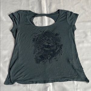 Stylish green graphic tee perfect for casual outings. Features a unique design for a trendy look that also has an open back.