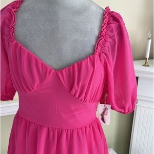 New with tags. Wanna be Barbie? This dress is perfect for you. Summery Jessica Simpson hot pink babydoll mini dress with short sheer puffy sleeves, bralette front, and smocked backing for the perfect fit. Top layer is sheer but the dress is fully lined except for sleeves. 100% polyester, machine washable.